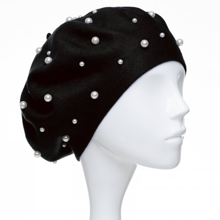 Comandă online o Bereta neagra, cu perle fine aplicate pe toata suprafata, din bumbac si lana cu livrare rapidă prin curier sau la easybox!