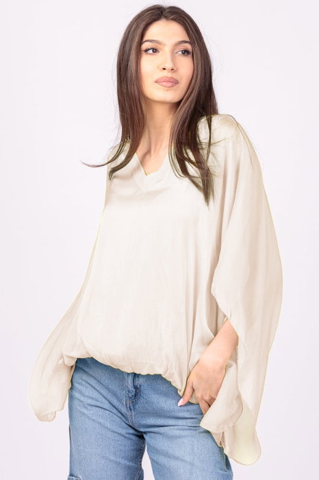 Are o dublura tip maiou, confectionata din amestec de vascoza si elastan, material extrem de lejer si elastic, lucru ce face ca bluza sa se potriveasca pentru mai multe marimi La baza partea exterioara este cusuta de cea interioara ceea ce da un efect…
