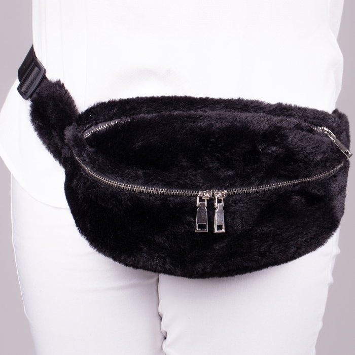 Materialul din care este confectionata borseta este blanita artificiala neagra Se inchide in fata cu fermoar argintiu Buzunare: un buzunar exterior ce se inchide cu fermoar Sistem de prindere: curea reglabila Dimensiuni: lungime 40 cm, latime…