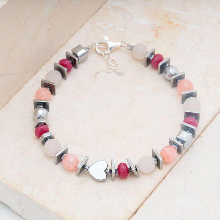 Bratara handmade cu cuart roz mat, agate colorate (6 mm) si elemente de hematit lucios Incuietoare si lant prelungitor din argint in forma de inimioare. Bijuteria se va livra in cutiuta de cadou oferita gratuit. Dimensiuni: lungime bratara 18 cm plus…