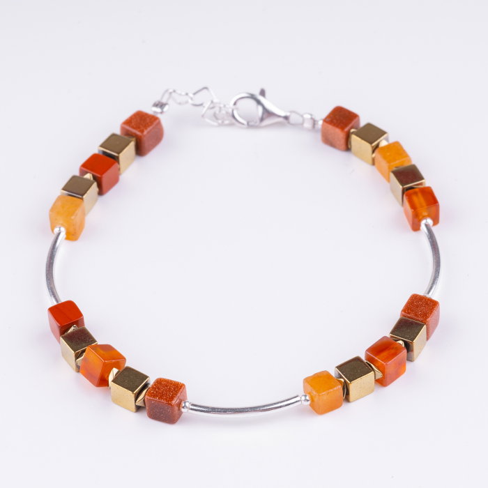 Bratara handmade cu tuburi curbe din argint, cuburi de carneol (4 mm) si cuburi de hematit auriu mat si lucios (4mm). Incuietoare si lant prelungitor din argint in forma de inimioara. Bijuteria se va livra in cutiuta de cadou oferita gratuit….