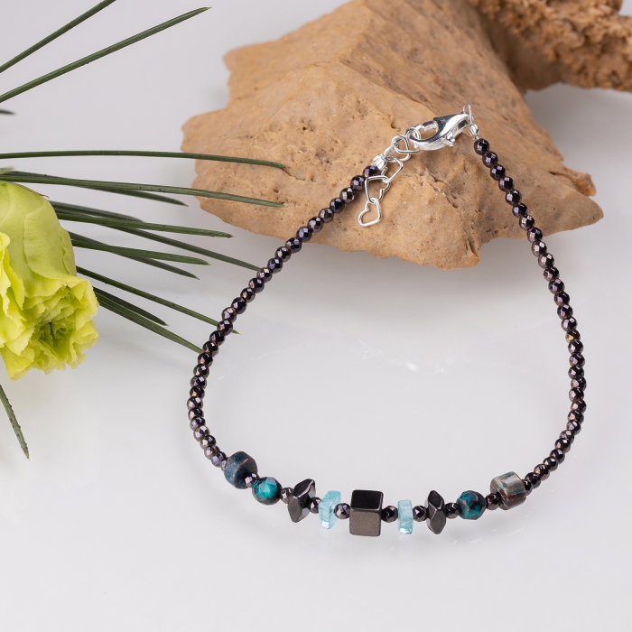 Bratara handmade cu pietre fatetate din hematit cu tenta de maroniu de 1,5 mm. In partea din mijoc are pietre de hematit de diferite forme, crisocola fatetat si placute de apatit si howlit. Incuietoare si lant prelungitor din argint. Poza cu doua…