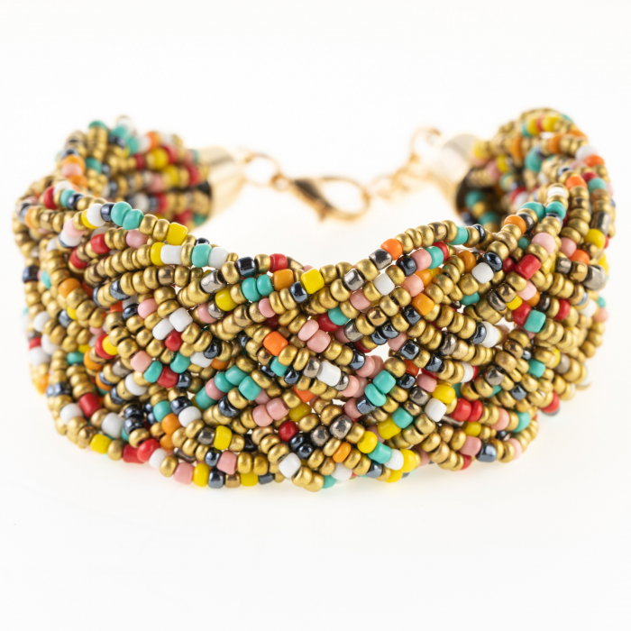 Bratara bogata, decorativa, din 4 sirur rasucite de margelute. Sistem de inchidere cu incuietoare tip carabina si lant prelungitor din metal auriu Descriere dimensiuni: lungimea bratarii 17 cm, latime 30cm, lantisor prelungitor 7 cm. Nuantele pot varia…