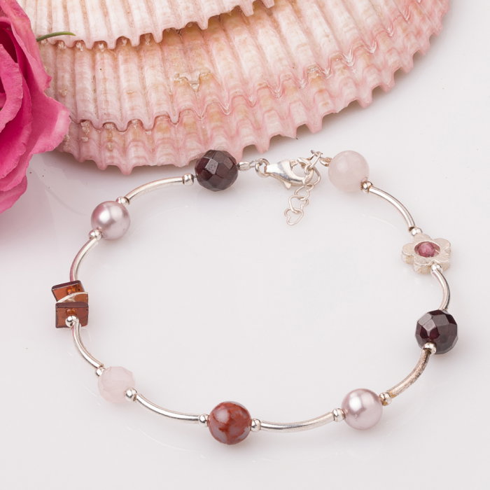 Bratara handmade cu tuburi curbe din argint, kiwi howlit (6 mm), granate fatetate si plate (6 mm), cuart roz fatetat (6 mm) si perle sintetice (6 mm). Mai contine o piesa din argint in forma de floricica ( 8 mm). Incuietoare si lant prelungitor…