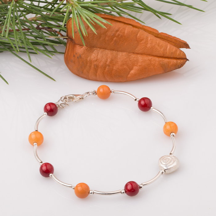 Bratara handmade cu tuburi curbe din argint, agate (6 mm) si perle sintetice (6 mm). Mai contine o piesa din argint in forma de inimioara ( 8 mm). Incuietoare si lant prelungitor din inimioare de argint. Bijuteria se va livra in cutiuta de cadou…