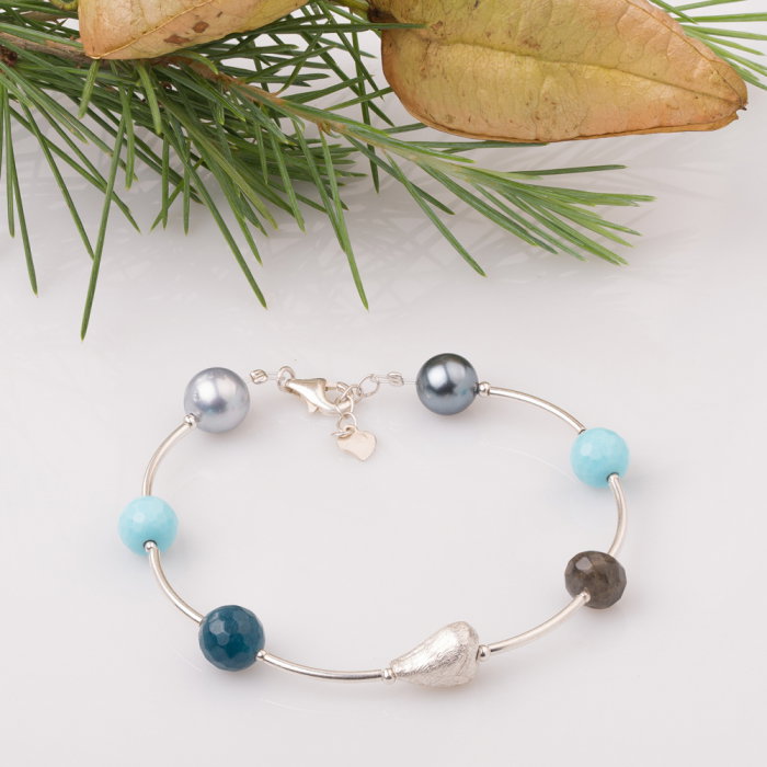 Bratara handmade cu tuburi curbe din argint, cuart fatetat (8 mm), howlit fatetat (8 mm) si perle sintetice (8 mm). Mai contine o piesa din argint in forma de inima. Incuietoare si lant prelungitor din argint cu terminatie in forma de inimioara….