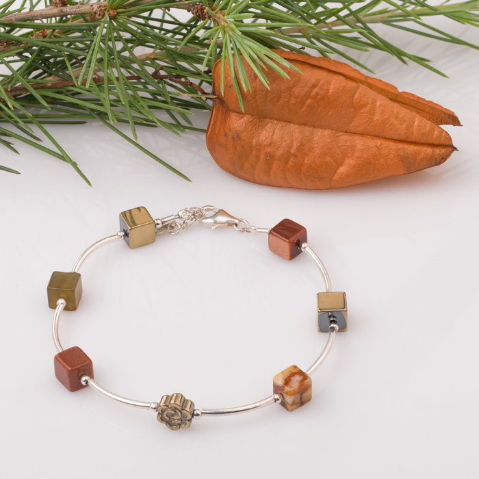 Bratara handmade cu tuburi curbe din argint, cuburi de jasp (6 mm), cuburi de piatra lunii sintetica (6 mm) si cuburi de hematit (6mm). Mai contine o piesa din hematit in forma de floare. Incuietoare si lant prelungitor din argint cu terminatie…