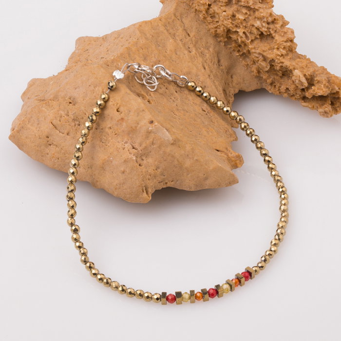 Bratara handmade cu pietre fatetate din hematit auriu de 1,5 mm. In partea din mijoc are pietre de cubic zirconia rosu, galben si portocaliu. Incuietoare si lant prelungitor din argint. Bijuteria se va livra in cutiuta de cadou oferita gratuit….