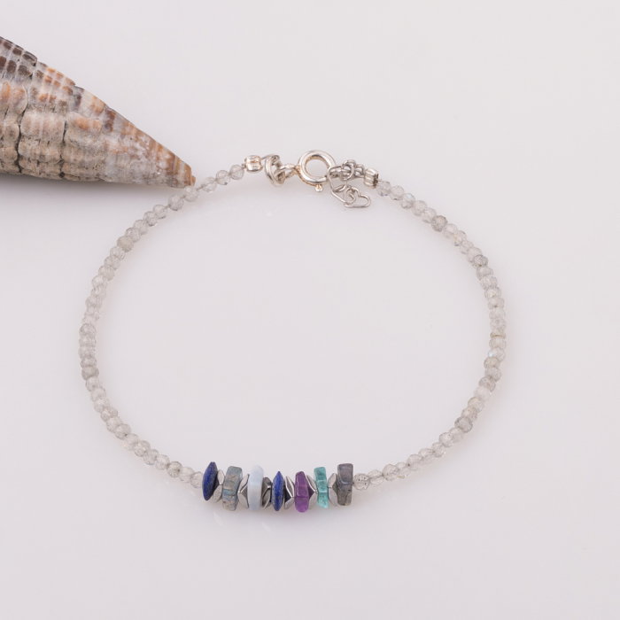 Bratara handmade subtire din pietre fatetate de labradorit de 1,5 mm. In partea din mijloc are placute de apatit, calcedonie, ametist, lapis lazili si labradorit. Intre aceste pietre sunt intercalate elemente de hematit. Incuietoare si lant prelungitor…