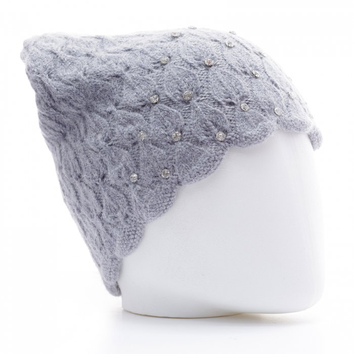 Caciula gri model tricotat cu fir de lurex si strasuri aplicate, captusita in interior