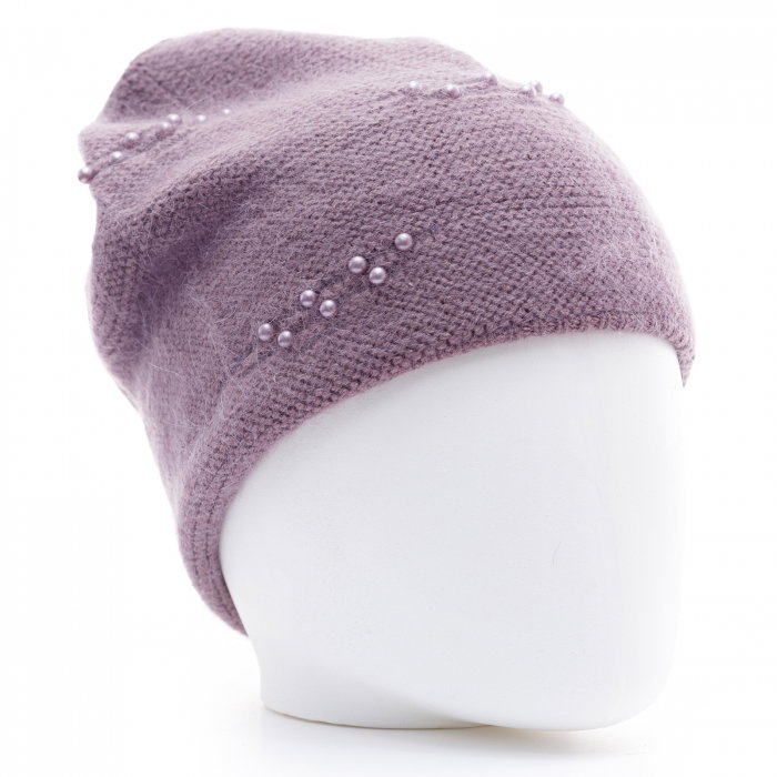 Caciula lila model tricotat cu perle fine aplicate, dublata in interior