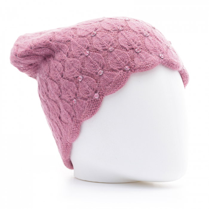 Caciula roz model tricotat cu fir de lurex si strasuri aplicate, captusita in interior