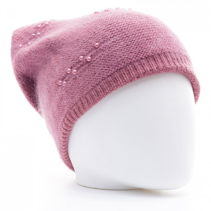 Caciula roz model tricotat cu perle fine aplicate, dublata in interior