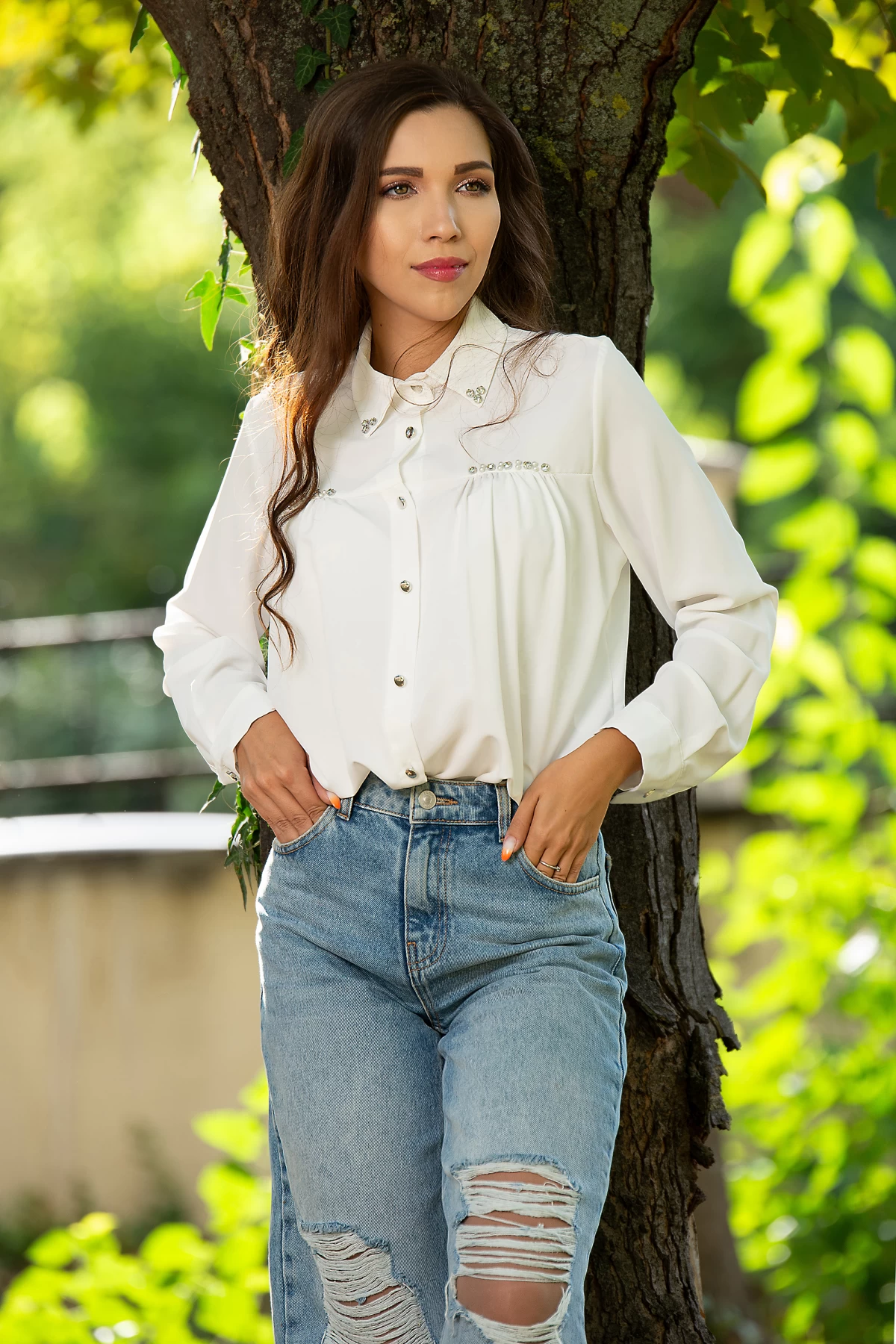Camasa dama office alba din voal decorata cu strassuri Culoare: albCroi: dreptTextura: voalManeci lungi Mansete late cu nasture argintiuGuler decorat cu strassuriPliseuri in zona bustului conturate cu perle si strassuriInchidere frontala cu nasturi argintiiCompozitie: 97% poliester 3% licra* Echipa noastra face toate eforturile in a prezenta cat mai bine culorile produselor prezentate pe site insa culorile pot diferi de situatia reala si pot varia în functie de setarile monitorului/dispozitivului dvs!
