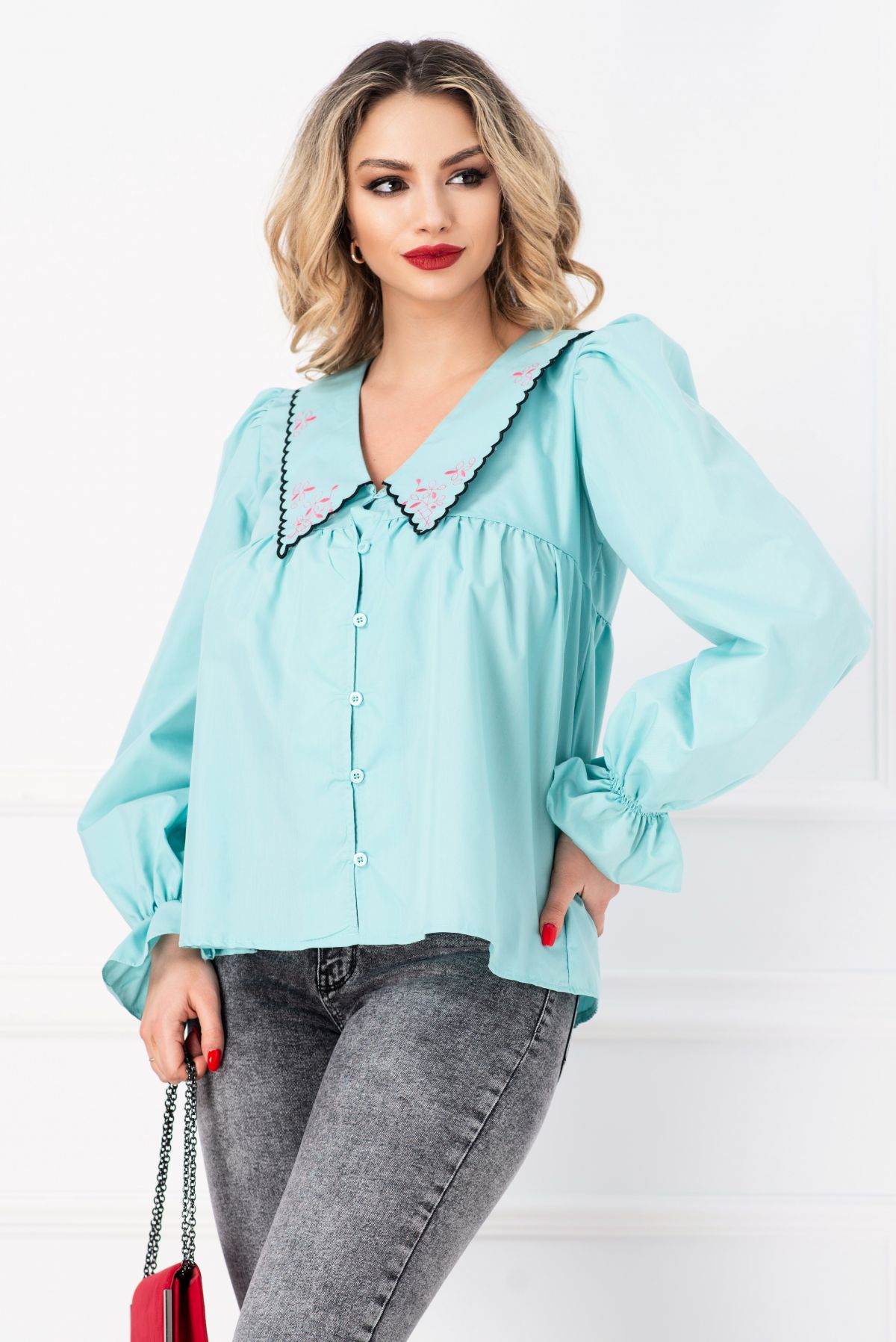 Comandă online o Camasa mint cu guler maxi brodat si maneci bufante cu livrare rapidă prin curier sau easybox!