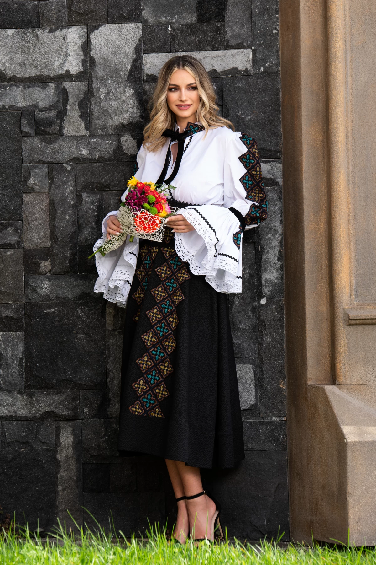 Camasa Romaneasca cu broderii stilizate Camasa Romaneasca de inspiratie traditionala din tesatura de bumbac. Pe maneci se regasec broderii stilizate cu simbolul rombului realizate in cruciulite turquoise cu volan fastuos ornamentat cu o broderie dantelata alba. Gulerul este reinterpretat intr-o maniera moderna oferind o nota de rafinament stil si feminitate.Compozitie: 95% bumbac 5% elastanFabricat in RomaniaBraul nu este inclus* Echipa noastra face toate eforturile in a prezenta cat mai bine culorile produselor prezentate pe site insa culorile pot diferi de situatia reala si pot varia în functie de setarile monitorului/dispozitivului dvs!