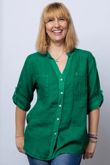 Are decolteu in V Are o banda cu paiete fine in jurul gatului, decolteului si coboara pe linia nasturilor, pe verticala Are maneca lunga ce se poate scurta cu un nasture Are doua buzunare aplicate in zona bustului Are o banda de dantela de 12 cm pe spate,…