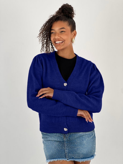 Are maneci lungi bufante cu mansete mai stranse, si decolteu in V Se inchide cu 3 nasturi decorativi diferiti, aurii Material: 80% acril, 20% poliester Descriere dimensiuni, fara a fi intins materialul: S M: umeri 37 cm, bust 100 cm, lungime 55 cm M L: umeri…