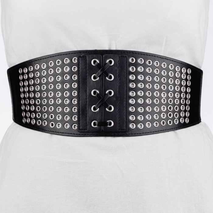 Centura corset lata din piele ecologica cu capse metalice argintii si elastic la spate