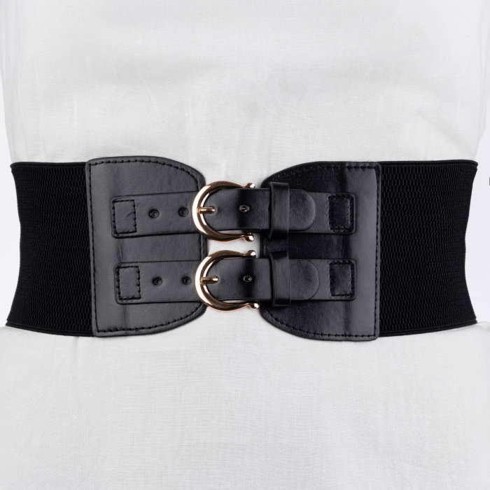 Centura corset lata din piele ecologica cu doua catarame aurii in fata si elastic la spate