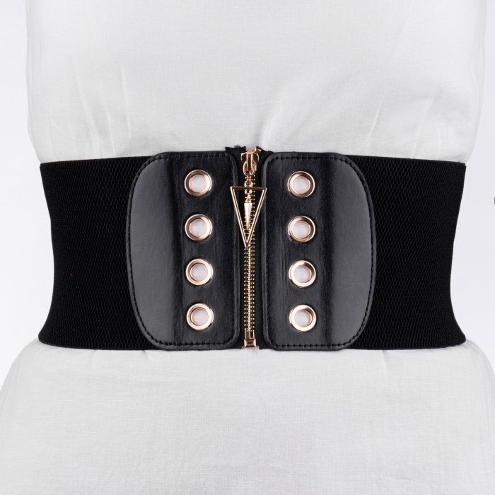 Datorita elasticului ( latime de 12 cm), cureaua se potriveste mai multor marimi Capse si fermoar metalice aurii Dimensiuni: circumferinta minima 64 cm, circumferinta maxima 68 cm Nuantele pot varia usor in realitate, in functie de lumina si setarile…