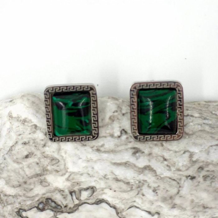 Sistem de prindere cu surub, cu opritor din metal Materiale: otel inotidabil ( stainless steel) si malachit (piatra naturala) Dimensiuni: inaltime 1.5 cm, latime 1.2 cm Nuantele pot varia usor in realitate, in functie de lumina si setarile fiecarui…