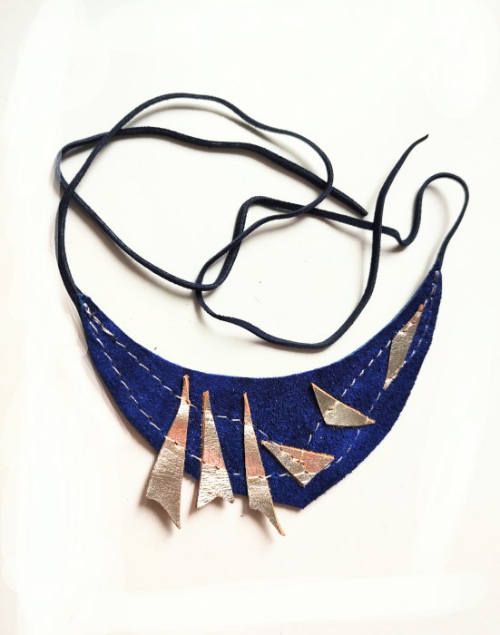 Colier albastru electric statement din piele naturala, spirit festiv ,unicat