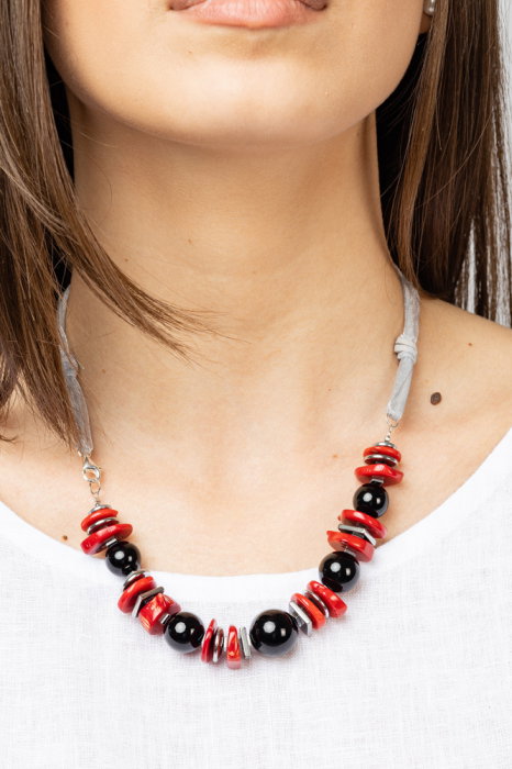 Colier handmade din onix (12 -14 mm). Intre aceste pietre sunt intercalate placute de hematit argintiu si coral rosu neregulat Colierul are in partea din spate organza gri argintie dublata de un fir de imitatie piele tot gri Incuietoare de tip carabina…
