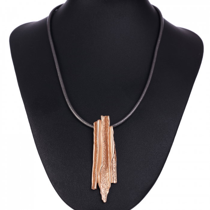 Colier cu pandant bara cu striatii pe un fir din piele ecologica gri metalizat mat Sistemul de prindere al colierului este incuietoare tip carabina cu lant prelungitor Dimensiuni: lungime colier 45 cm, lant prelungitor 7 cm Nuantele pot varia usor…