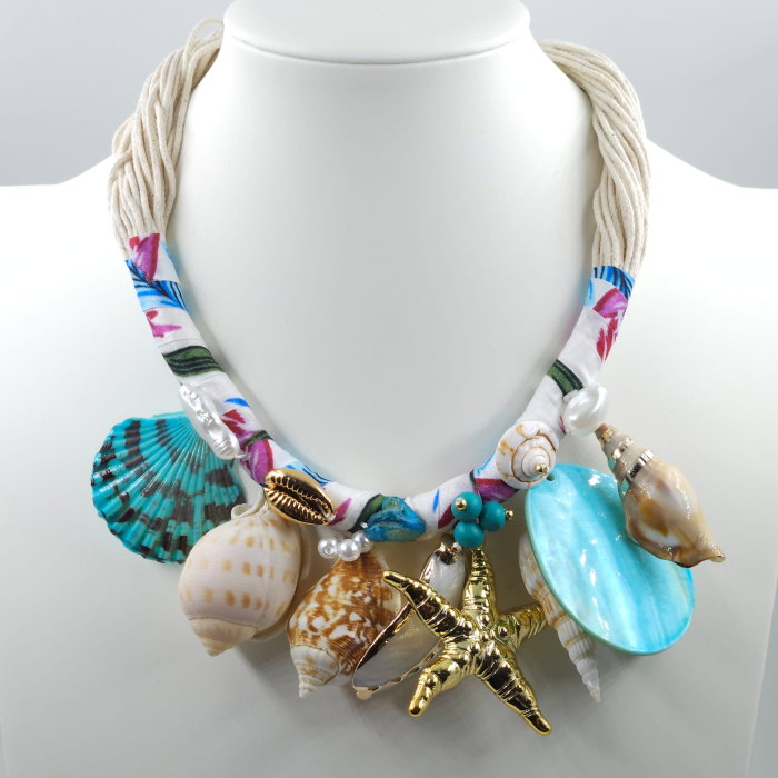 Tip produs: Colier statement dama Stil: Marin, resort, boho-luxury Design: Elemente inspirate din mare Elemente decorative: Scoici, detalii aurii Structura: Voluminos, piesa centrala accentuata Sistem prindere: Inchidere metalica cu lant de ajustare…
