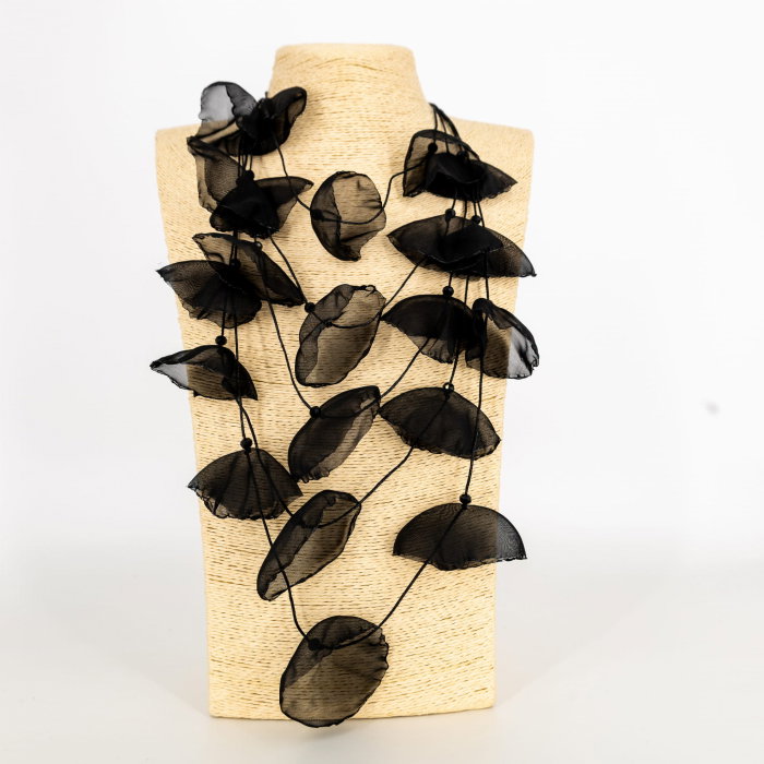 Tip produs: Colier statement Stil: Modern, artistic, elegant Design: Petale textile 3D suprapuse Material: Textil fin semi-transparent, rasina, sfoara cerata, margele lucioase fatetate Structura: Multisir, efect aerat Greutate: Usor, confortabil…