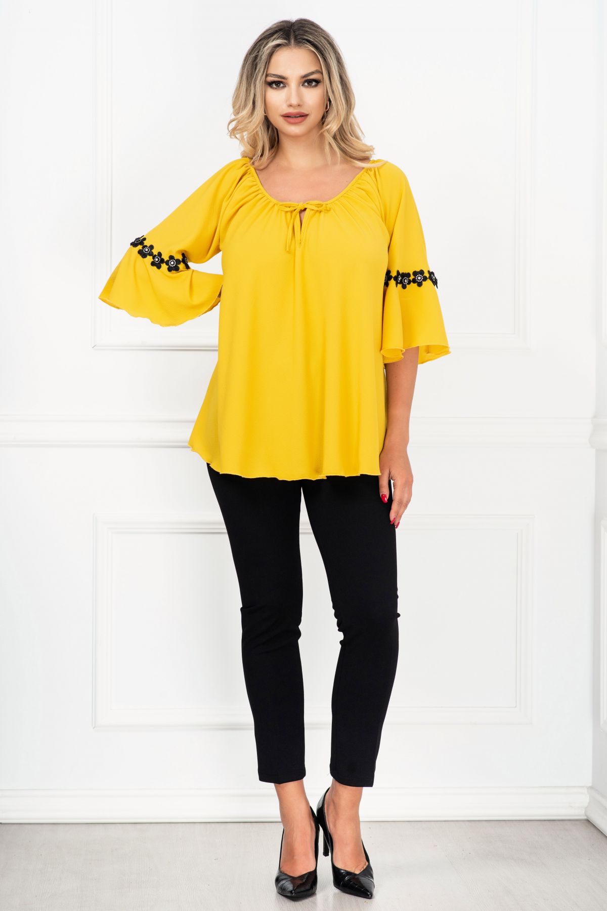Compleu dama elegant mustar cu maneca clopot si flori 3D By InPuff Setul este format din bluza eleganta si pantalon tip colantBluza mustar Maneci trei sferturi Terminatie tip clopot la manecaDecolteu barcutaDecupaj in V si fundita in zona decolteuluiTextura:crepFlori 3D negre cu strasuriCroi lejerPantalon negru cu talie inaltaMaterial elastic tip colantCroi conic Elastic in talieNu prezinta buzunareFabricat in Romania✅ Cauti un compleu de dama confortabil? Gasesti aici compleuri ieftine pentru femei din doua piese elegante sau casual perfecte pentru tinutele office sau de zi. Cu cel mai ieftin pret din online vei avea fara prea mult efort o tinuta de zi eleganta completa.* Modelul nostru poarta marimea 36(S)!* Echipa InPuff face toate eforturile in a prezenta cat mai bine culorile produselor prezentate pe site insa culorile pot diferi de situatia reala si pot varia în functie de setarile monitorului/dispozitivului dvs!