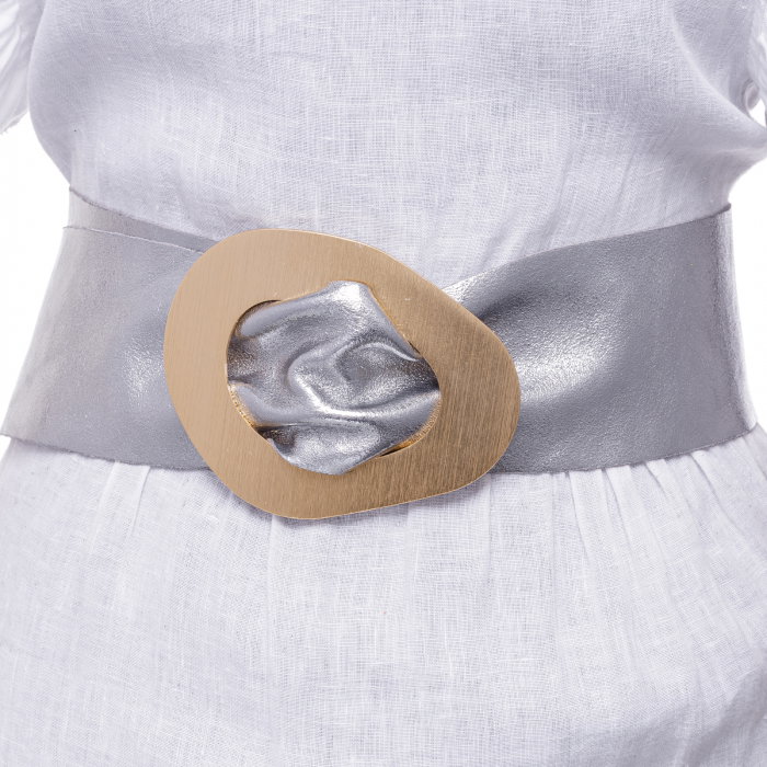 Curea argintie din piele naturala cu latime de 8 cm, catarama aurie neregulata