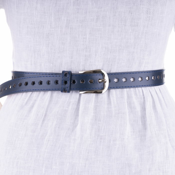 Comandă online o Curea bleumarin de 2.5 cm cu flori decupate, din piele ecologica cu catarama metalica argintie cu livrare rapidă prin curier sau la easybox!