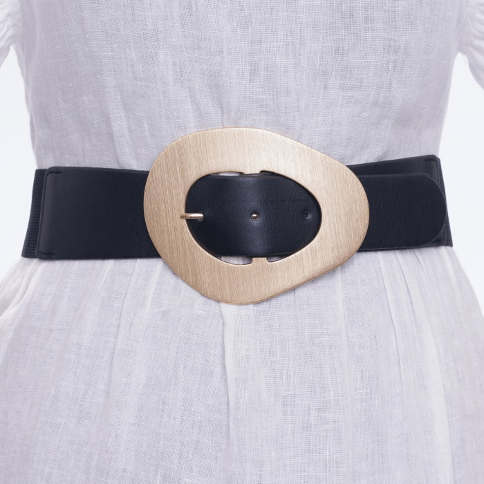 Catarama metalica 12.5 x 10 cm este aplicata pe pielea ecologica ce se continua cu material elastic de aceeasi culoare ca si pielea ecologica Material: elastic, metal comun, poliuretan Dimensiuni: lungime 85 cm, se intinde pana la 100 cm, latime…