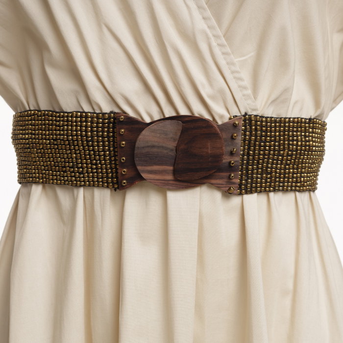Curea elastica cu margelute din sticla auriu metalizat, catarama din lemn natural