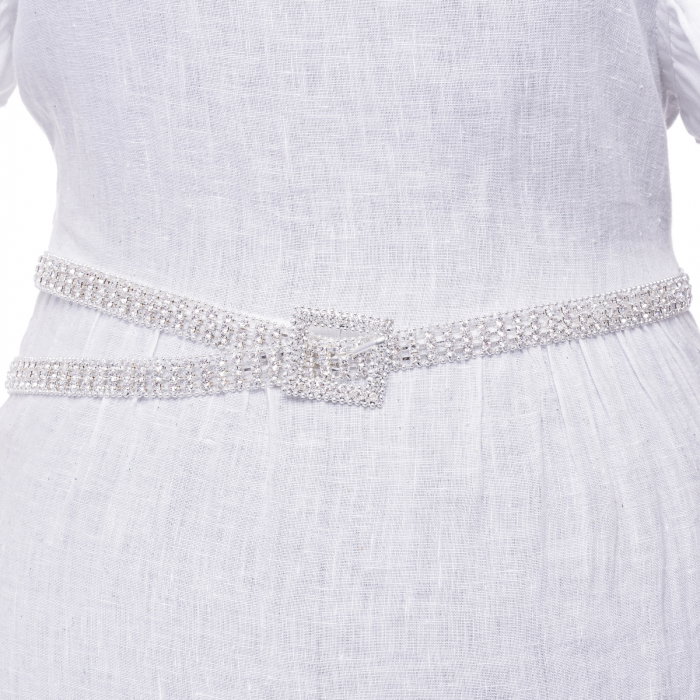Comandă online o Curea metalica argintie cu strasuri albe de 1.5 cm, flexibila cu catarama patrata cu livrare rapidă prin curier sau la easybox!