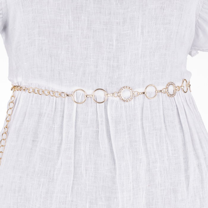 Curea delicata formata din cercuri metalice de 2 cm flexibile si un lantisor cu care se ajusteaza marimea Material: metal comun si sticla Dimensiuni: lungime curea 62 cm, lungime lantisor 52 cm, latime banda 2 cm Nuantele pot varia usor in realitate,…