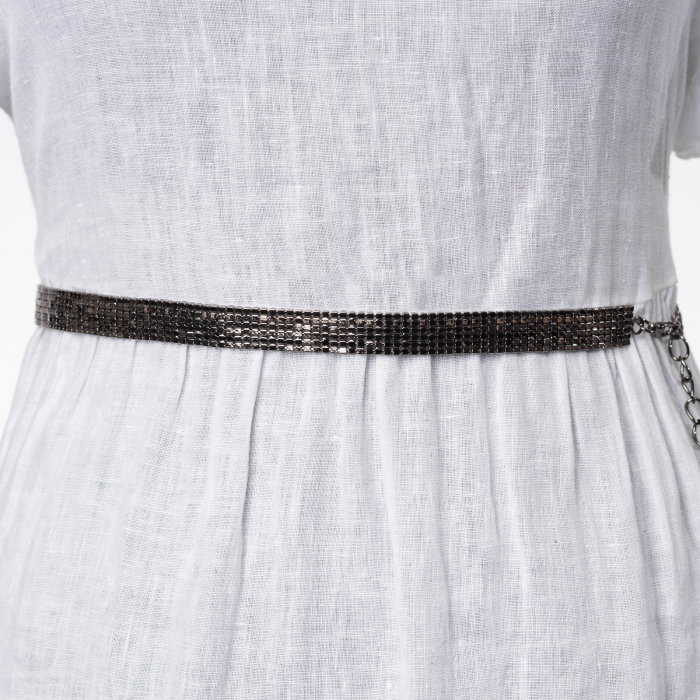 Curea delicata formata dintr-o banda metalica flexibila si un lantisor cu care se ajusteaza marimea Compusa din 6 randuri de strasuri fine. Material: metal comun si sticla Dimensiuni: lungime curea 62 cm, lungime lantisor 52 cm, latime banda…