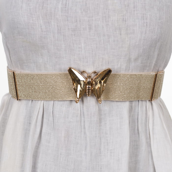 Catarama fluture cu sticla si metal 5 cm x 7 cm, ce se inchide la mijloc, in parte din fata Material: poliester, metal comun Dimensiuni: lungime reglabila intre 45-85 cm, se intinde pana la 95 cm, latime 4 cm banda elastica aurie Nuantele pot varia…