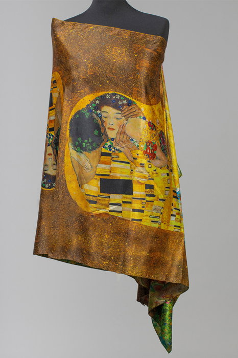 Esarfa cu doua fete, din matase, imprimata cu model inspirat dupa Sarutul de Gustav Klimt
