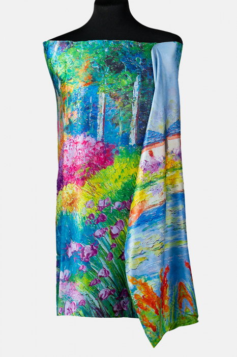 Comandă online o Esarfa cu doua fete, din matase, imprimata cu un peisaj campenesc cu gradini inflorite cu livrare rapidă prin curier sau la easybox!