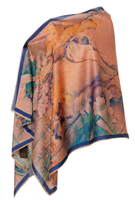 Comandă online o Esarfa dreptunghiulara cu doua fete, din matase, cu imprimeu floral pastelat in nuante de mov si portocaliu cu livrare rapidă prin curier sau la easybox!