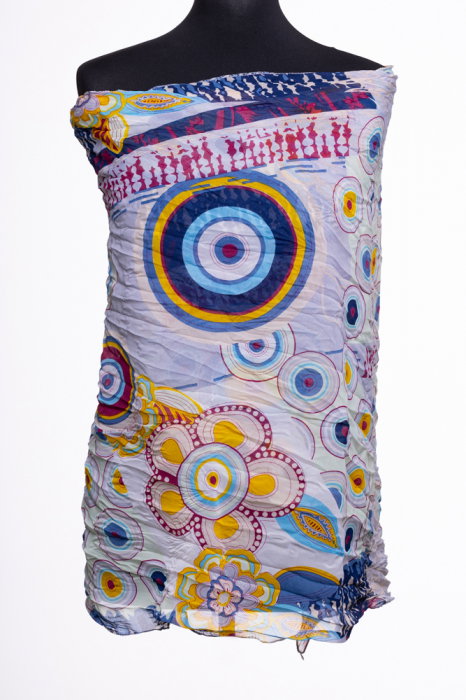Comandă online o Esarfa dreptunghiulara in colturi alungite, cu imprimeu cercuri colorate pe fundal bleu, din vascoza cu livrare rapidă prin curier sau la easybox!
