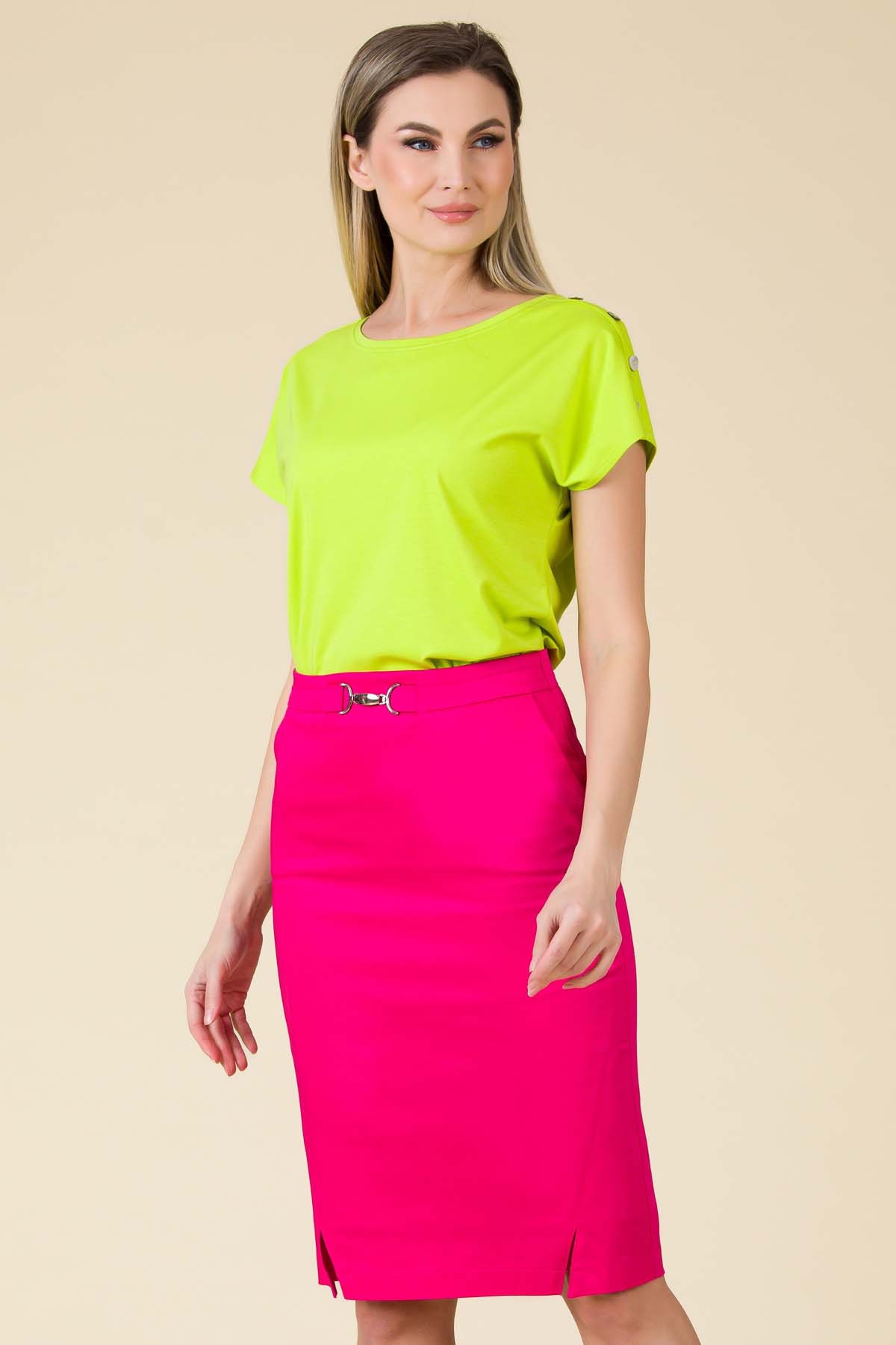 Fusta Andy din bumbac stretch captusita, forma pencil cu accesoriu metalic pe betelie si slituri oblice in fata.
