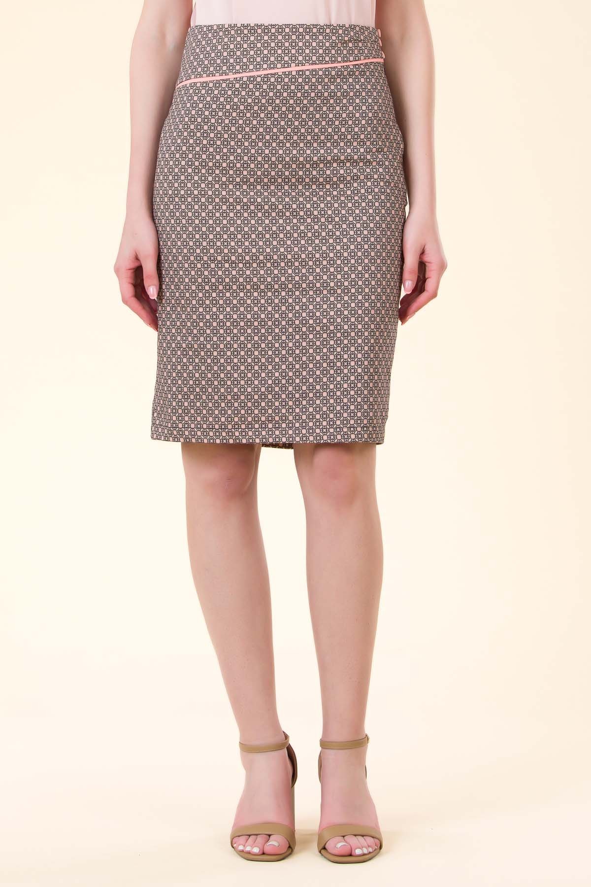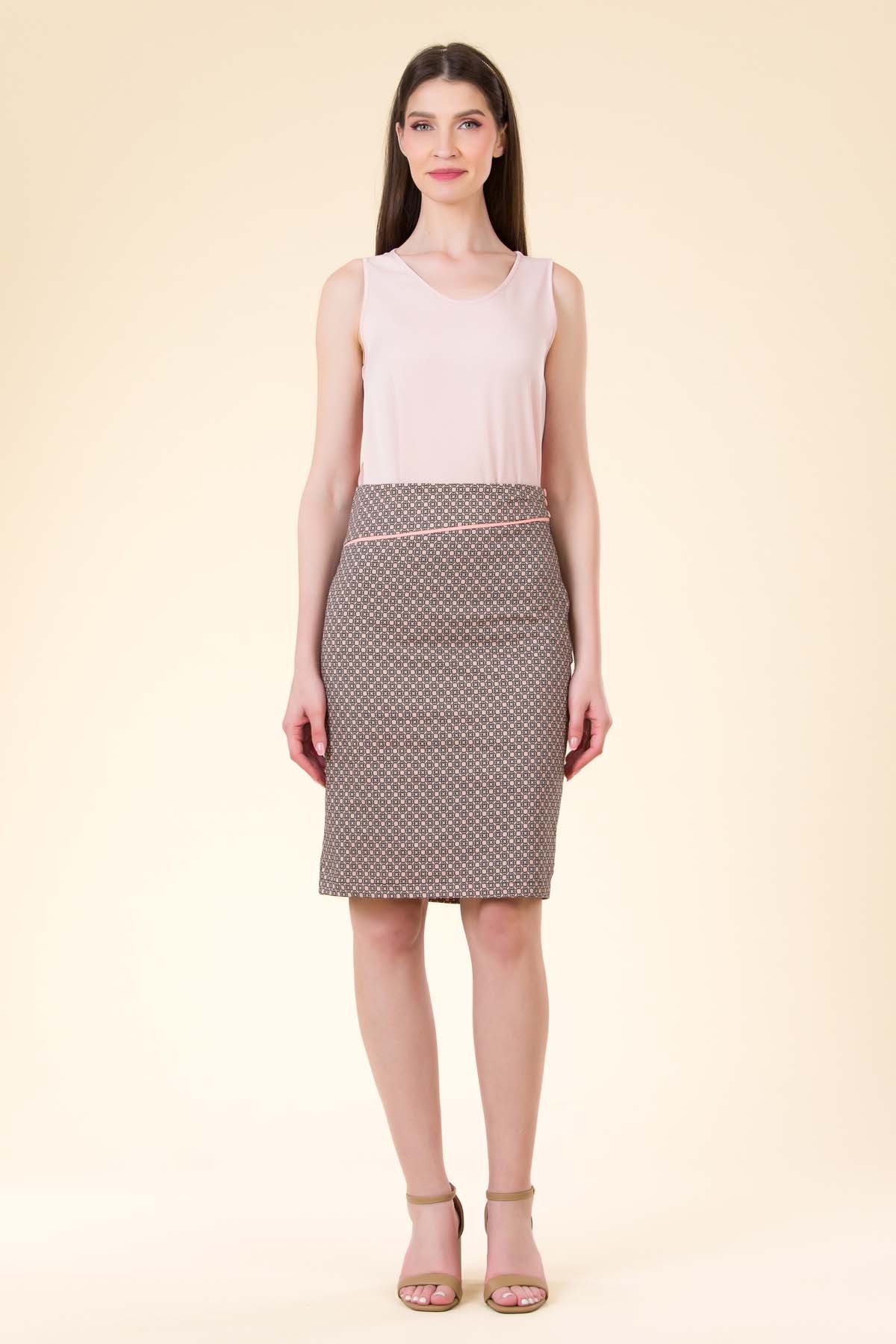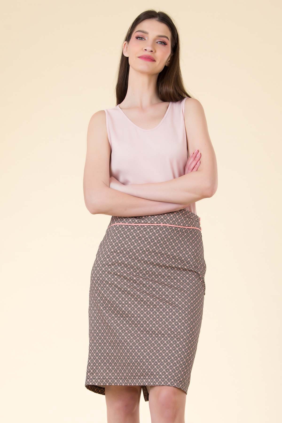 Fusta Maya din bumbac imprimat, croi pencil cu garnitura in talie si nasturi imbracati in material contrast.