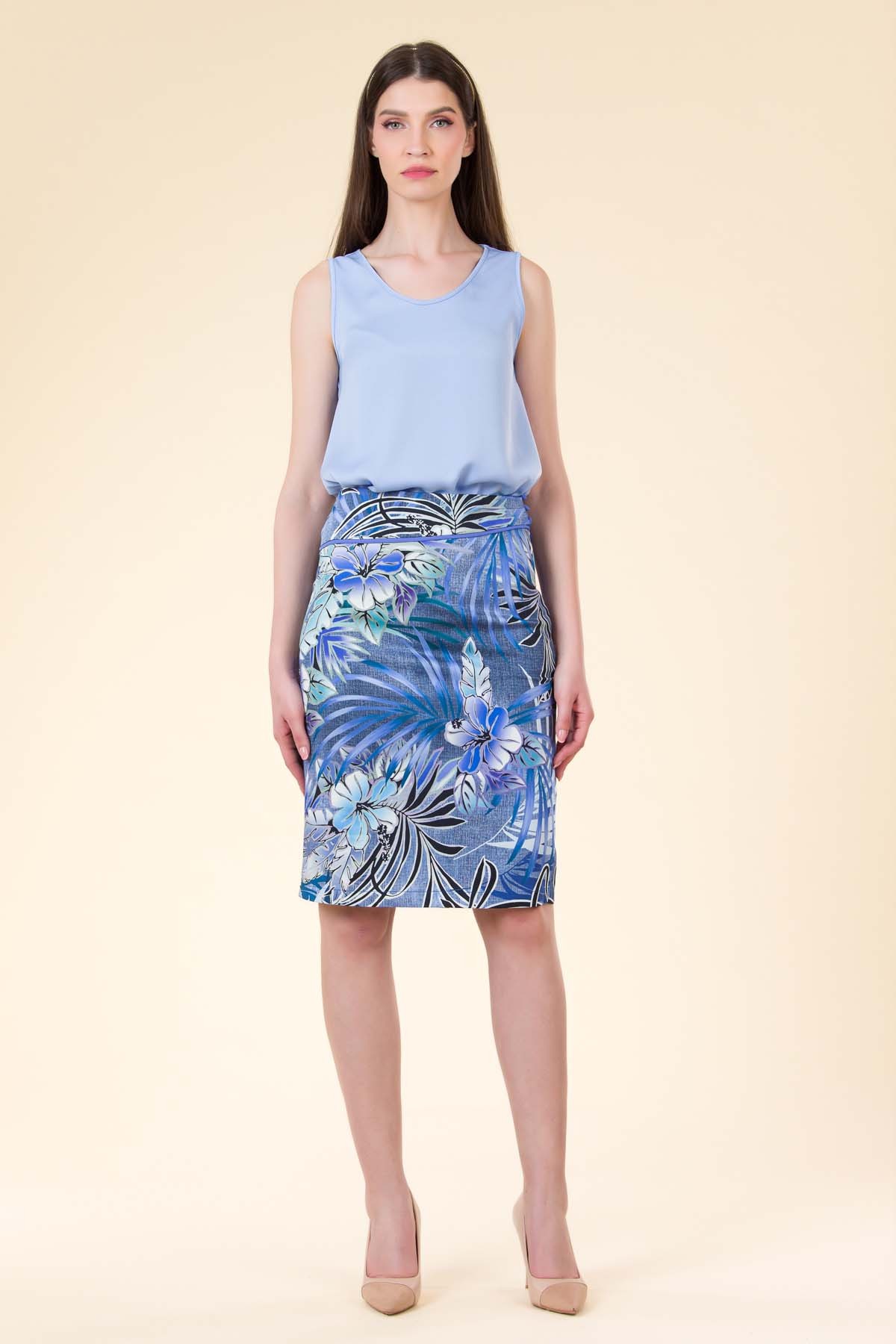 Fusta Maya din bumbac imprimat, croi pencil cu garnitura in talie si nasturi imbracati in material contrast.
