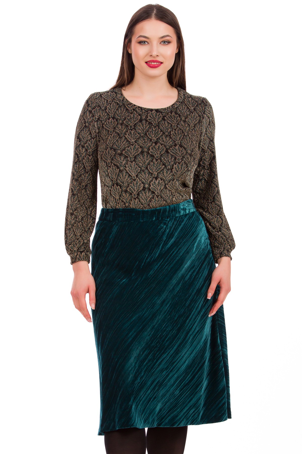 Fusta Adele din catifea, croi feminin pe bie, bata cu elastic in talie. Recomandata pentru evenimente de tip cocktail&evening.