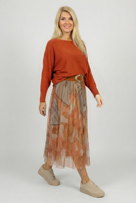 Comandă online o Fusta clos din tulle cu imprimeu floral in nuante de portocaliu si caramiziu cu livrare rapidă prin curier sau la easybox!