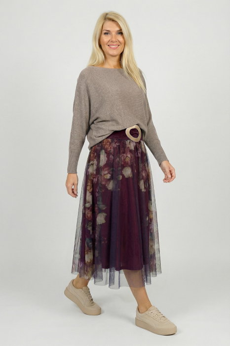 Fusta clos din tulle cu imprimeu lateral floral in nuante de visiniu